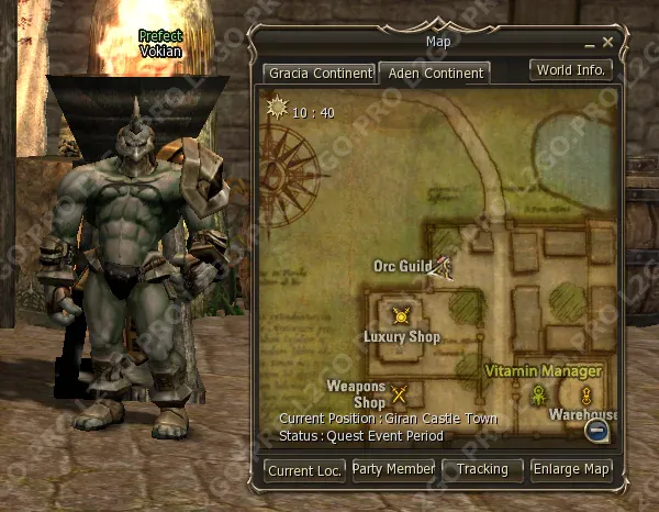 Отправляйтесь в Giran Castle Town к Prefect Vokian. Он даст задание — убить орков в Breka's Stronghold.