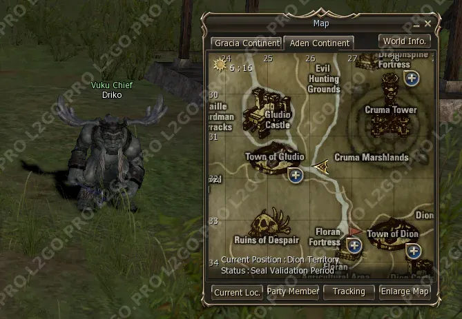 Найдите Martien в Giran Castle Town. Он расскажет вам о втором монстре — Gorr (36 уровень), который терроризирует окрестности Dion.
