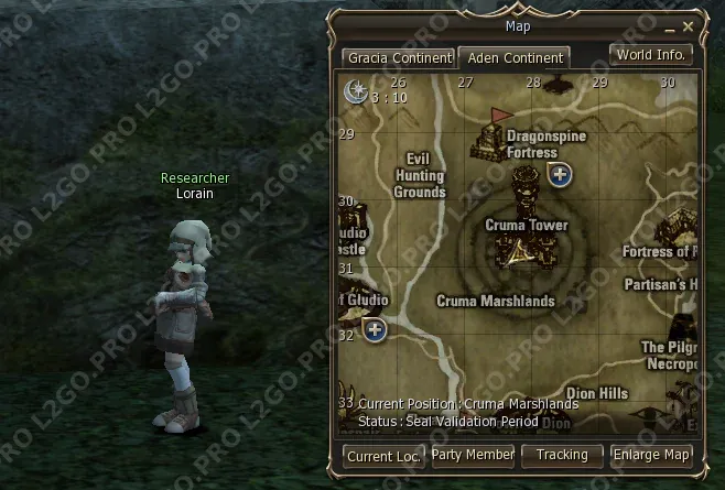Отправляйтесь к Researcher Lorain в Cruma Tower около Town of Dion.
