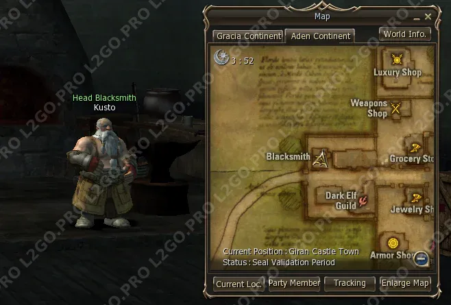 Отправляйтесь в Giran Castle Town к Head Blacksmith Kusto в кузнице (Blacksmith Guild).