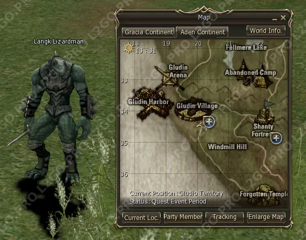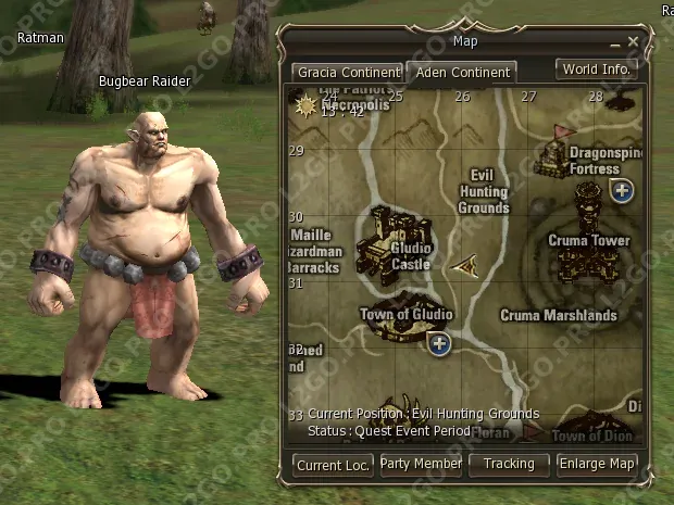 Телепортируемся в Town of Gludio (Город Глудио). В центре города, рядом с камой разговариваем с Bathis он даст задание найти и охотиться на Bugbear Raider они находятся справа от замка глудио, убиваем пока не получим 10