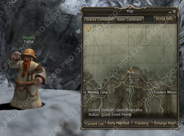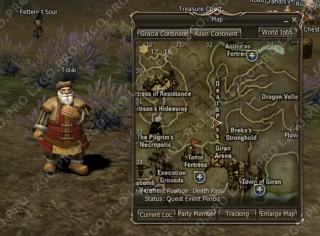 Телепортируйтесь в Town of Giran. Идите по дороге в Death Pass (Долина Смерти), чтобы найти Torai. Поговорите с ним и получите