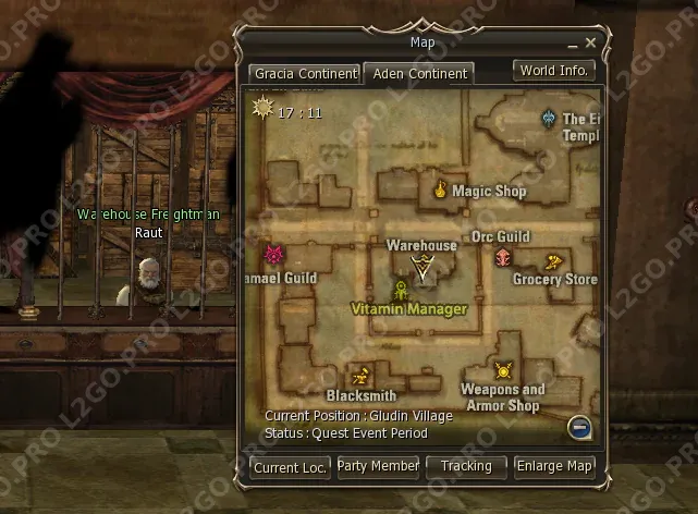 Вариант Глудин: Телепортируйтесь в Gludin Village. Поговорите с Warehouse Freightman Raut и получите Raut's Teleport Scroll.
