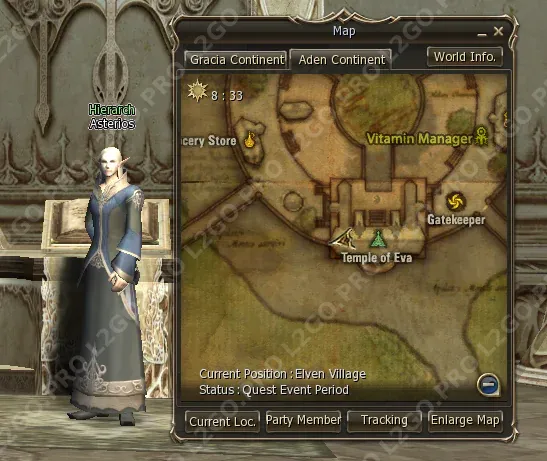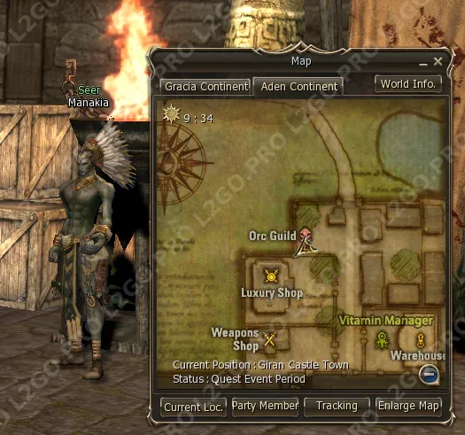 Телепортируйтесь в Orc Village и найдите Flame Lord Kakai. Он направит вас к Seer Manakia в Giran Castle Town. Найдите Seer Manakia.
